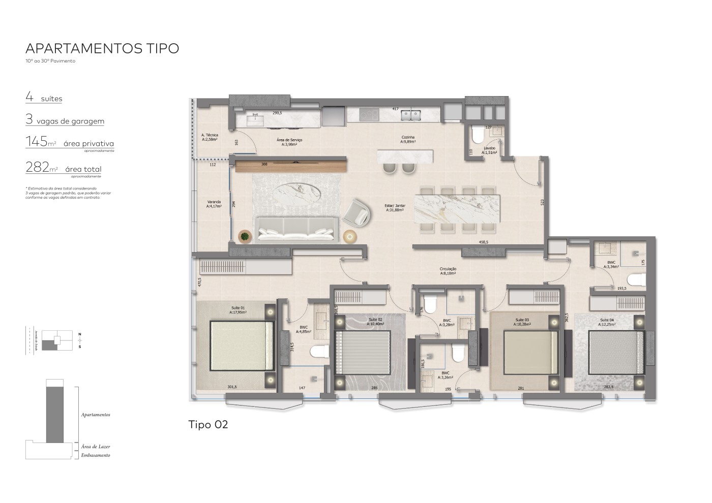 Apartamentos: 4 suítes, lavabo, sala de estar e jantar, cozinha com churrasqueira a carvão, área de